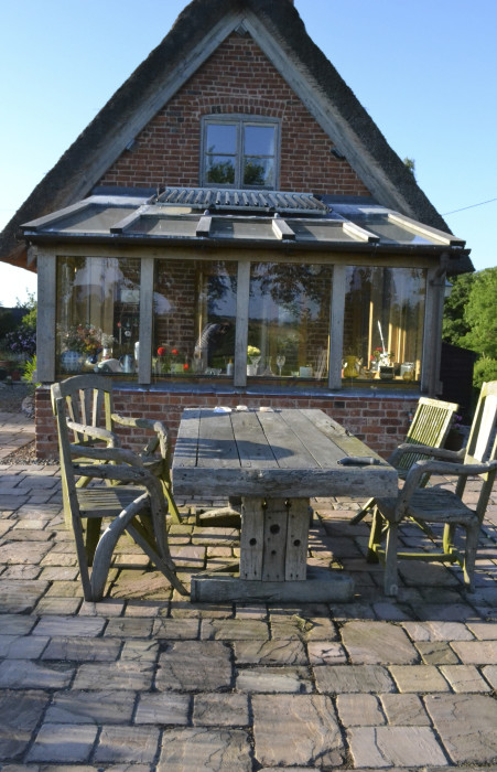 Features: Natural sandstone paving, tree swing, stone pathway.