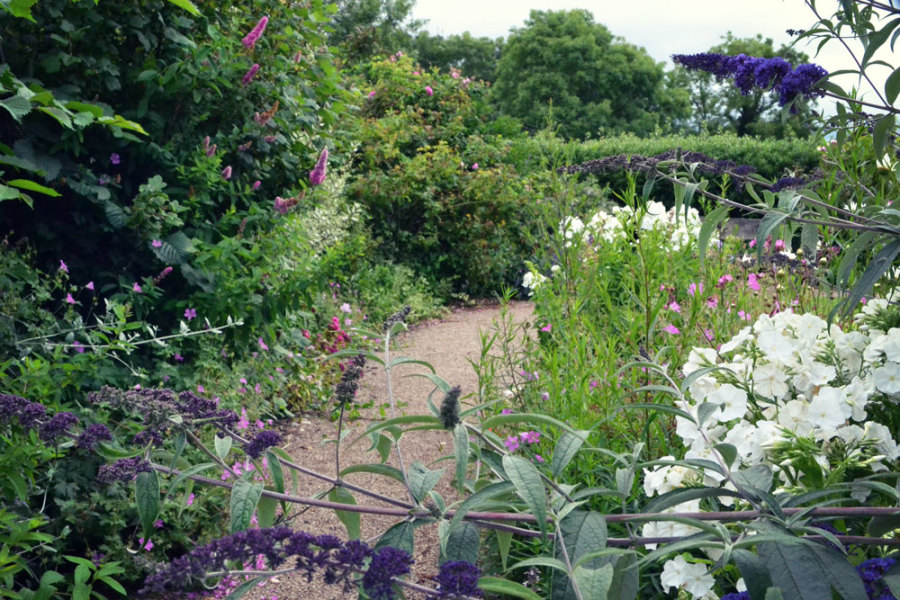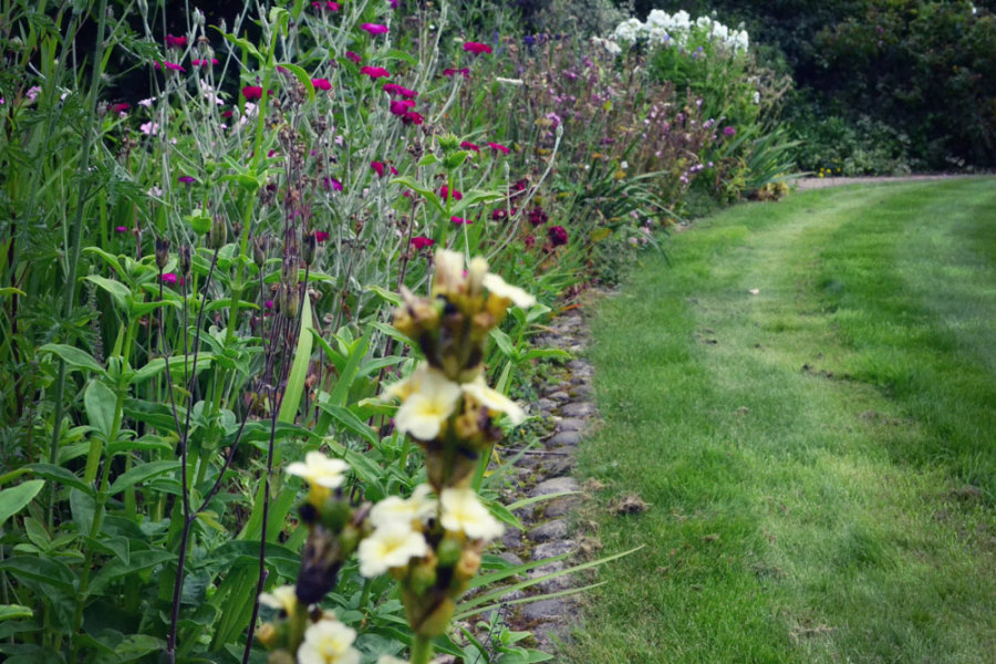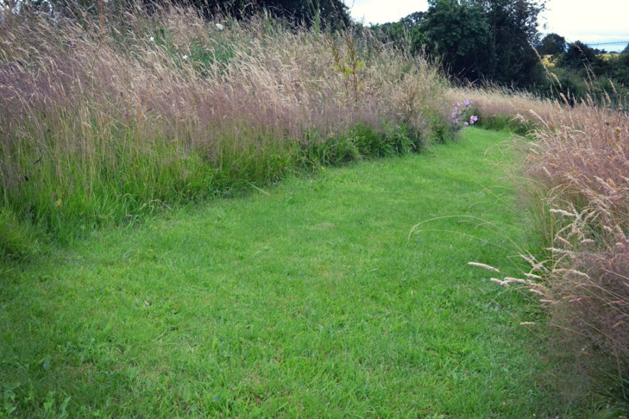 Planting: Cottage garden planting, wildflower meadow with mown paths, loose style
