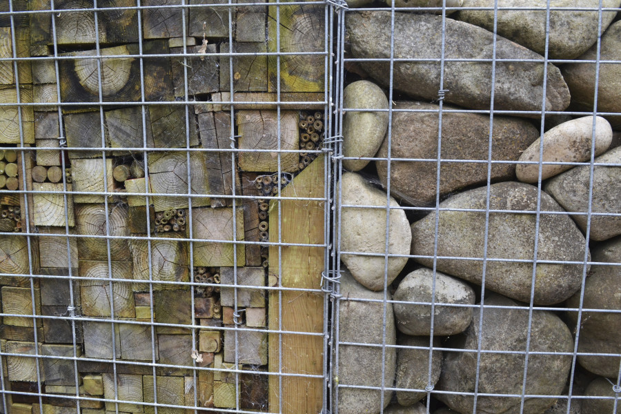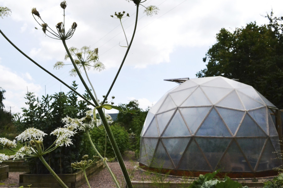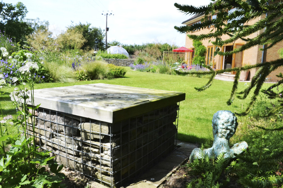 Features: Gabion wall and seating (reclaimed materials from site), geodesic greenhouse, raised vegetable beds, terrace natural stone paving with blue brick edging.
