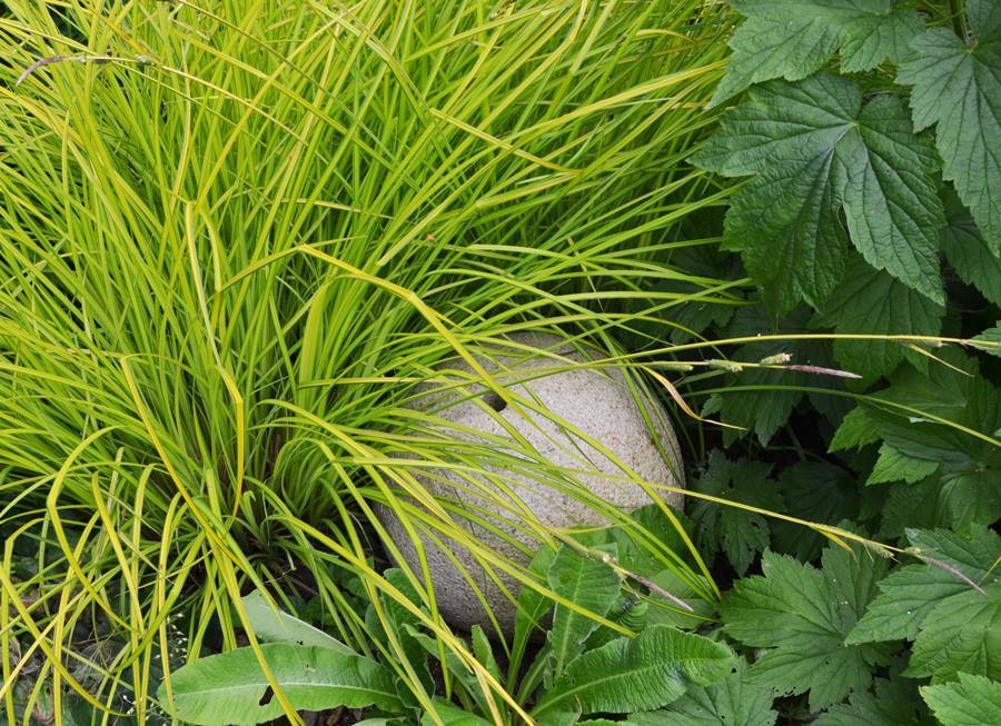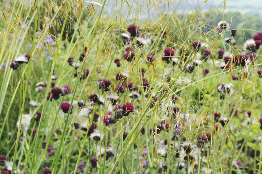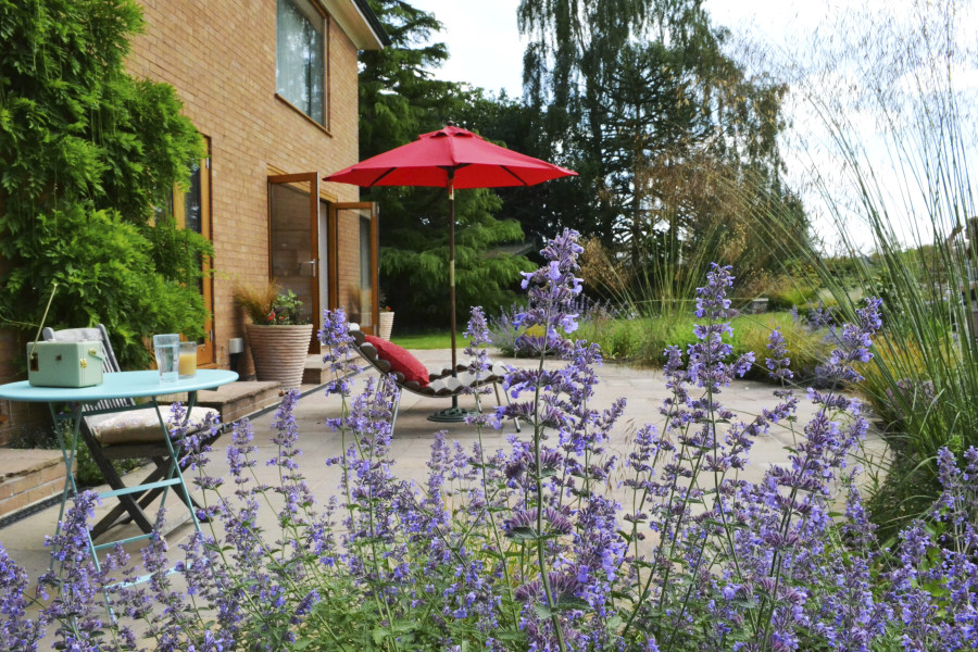 Planting: Prairie/cottage style, contrasting greens and purples.