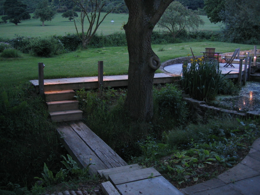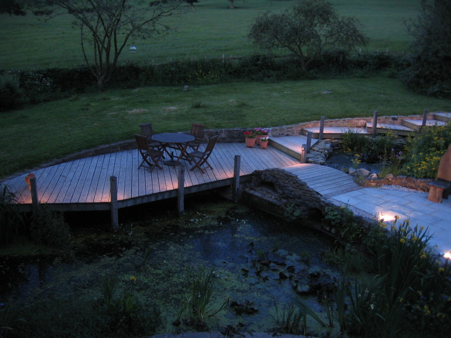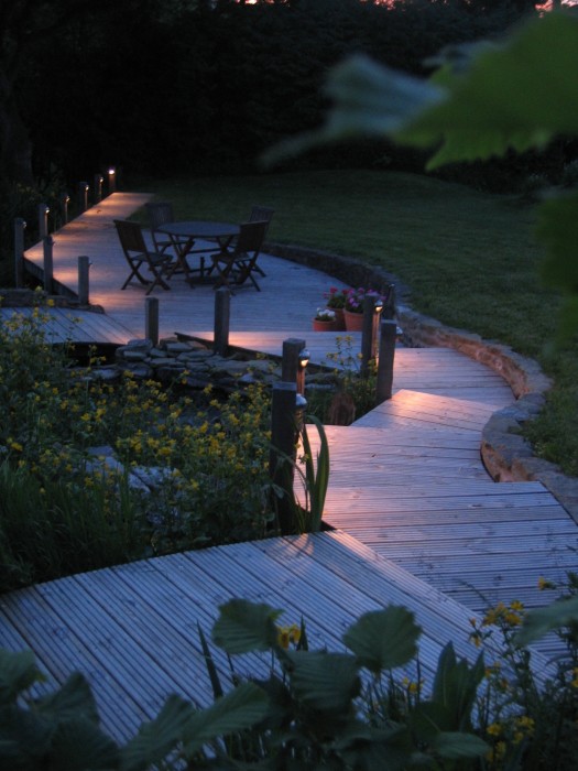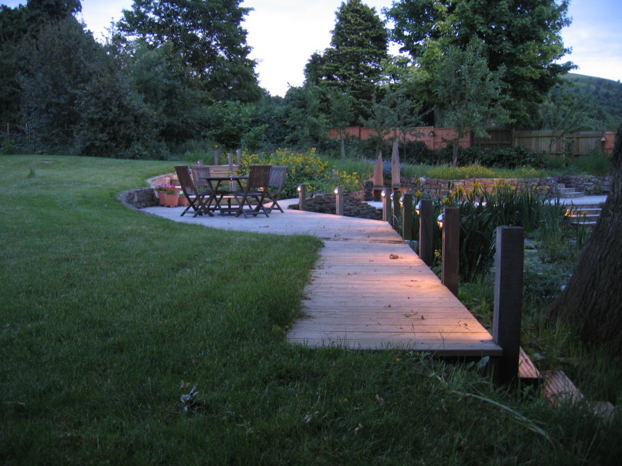 Features: Decking walkway and terrace, natural stone paving, garden lighting, natural stone retaining wall